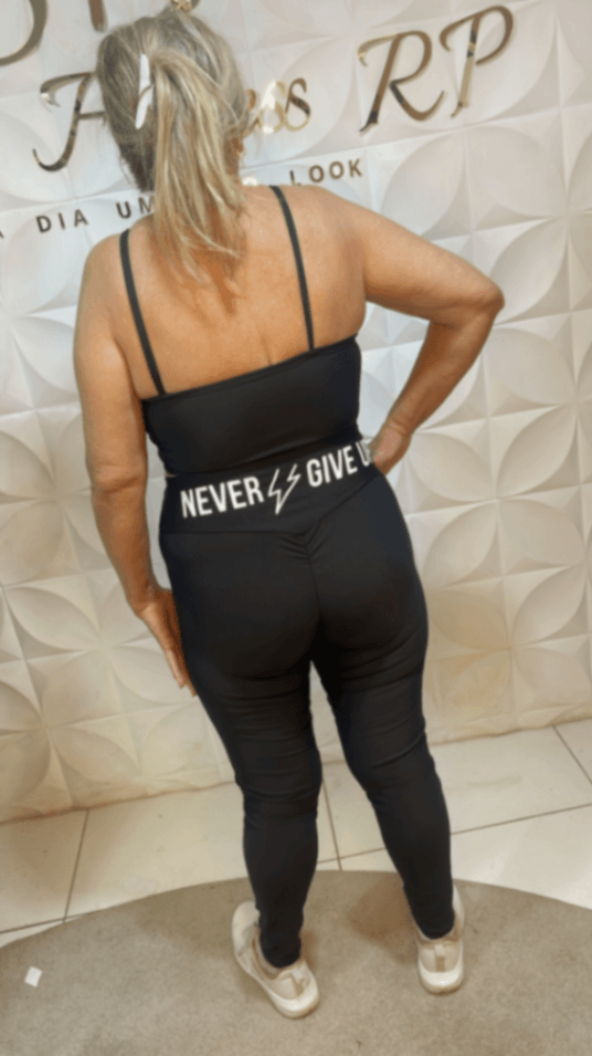 O Conjunto Never Give Up é muito mais que um look fitness: é uma declaração de força e persistência. Perfeito para quem não abre mão do clássico preto e busca um incentivo extra para ir além!