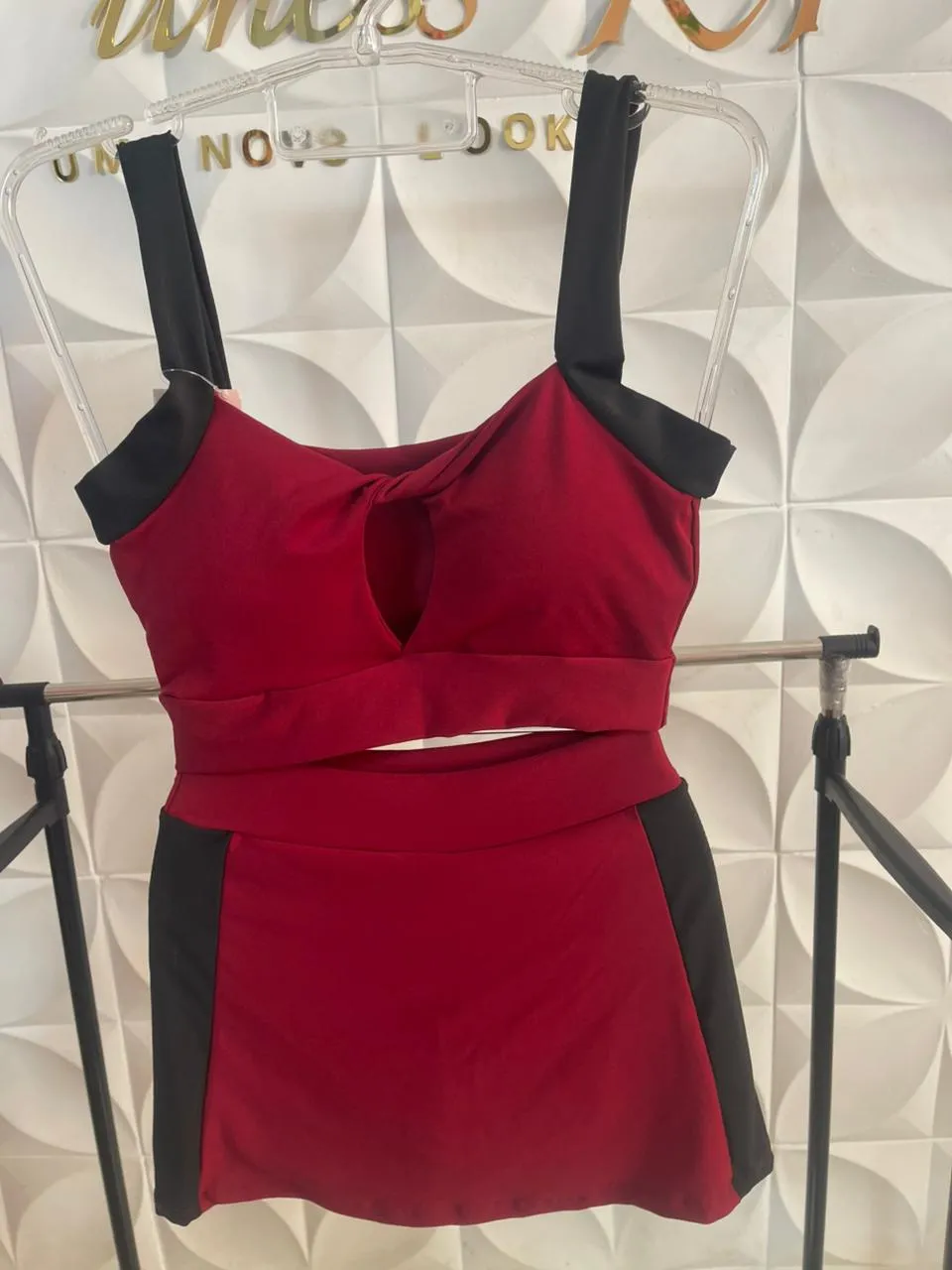 • Top Cropped com Recorte Estratégico: O top se destaca pelo recorte sensual na altura do busto, um detalhe cut out que confere um toque de audácia e modernidade, mantendo a sustentação.