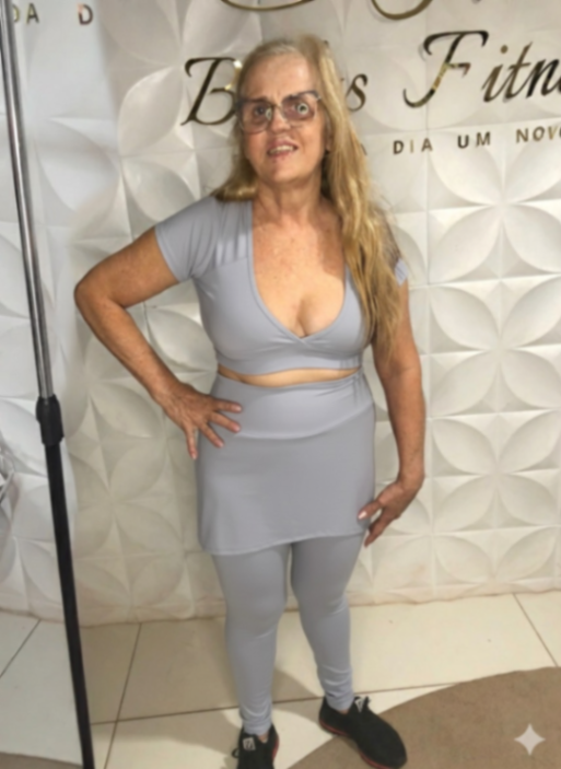 • Design Inovador: Conjunto em tecido de alta compressão que modela o corpo, composto por um cropped de manga curta com decote V e uma saia-calça (legging com saia acoplada) que oferece cobertura extra e um charme especial.